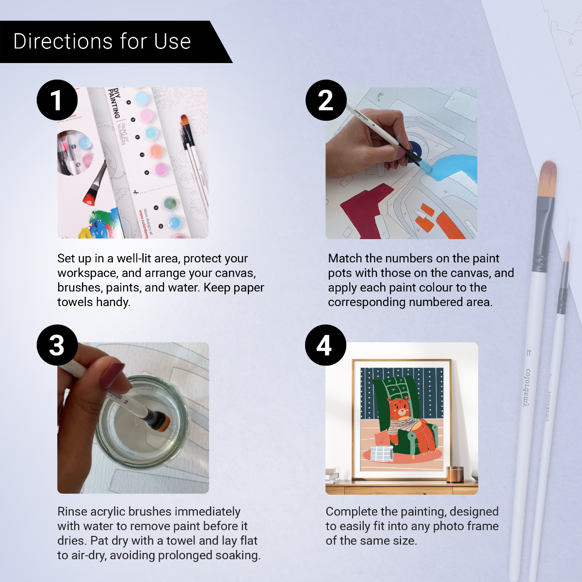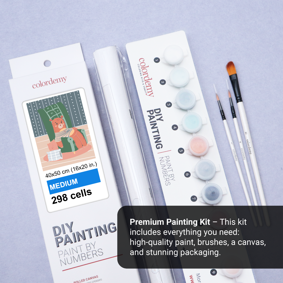 Prepare your materials: Gather your paint by numbers kit, including the canvas, paints, and brushes.