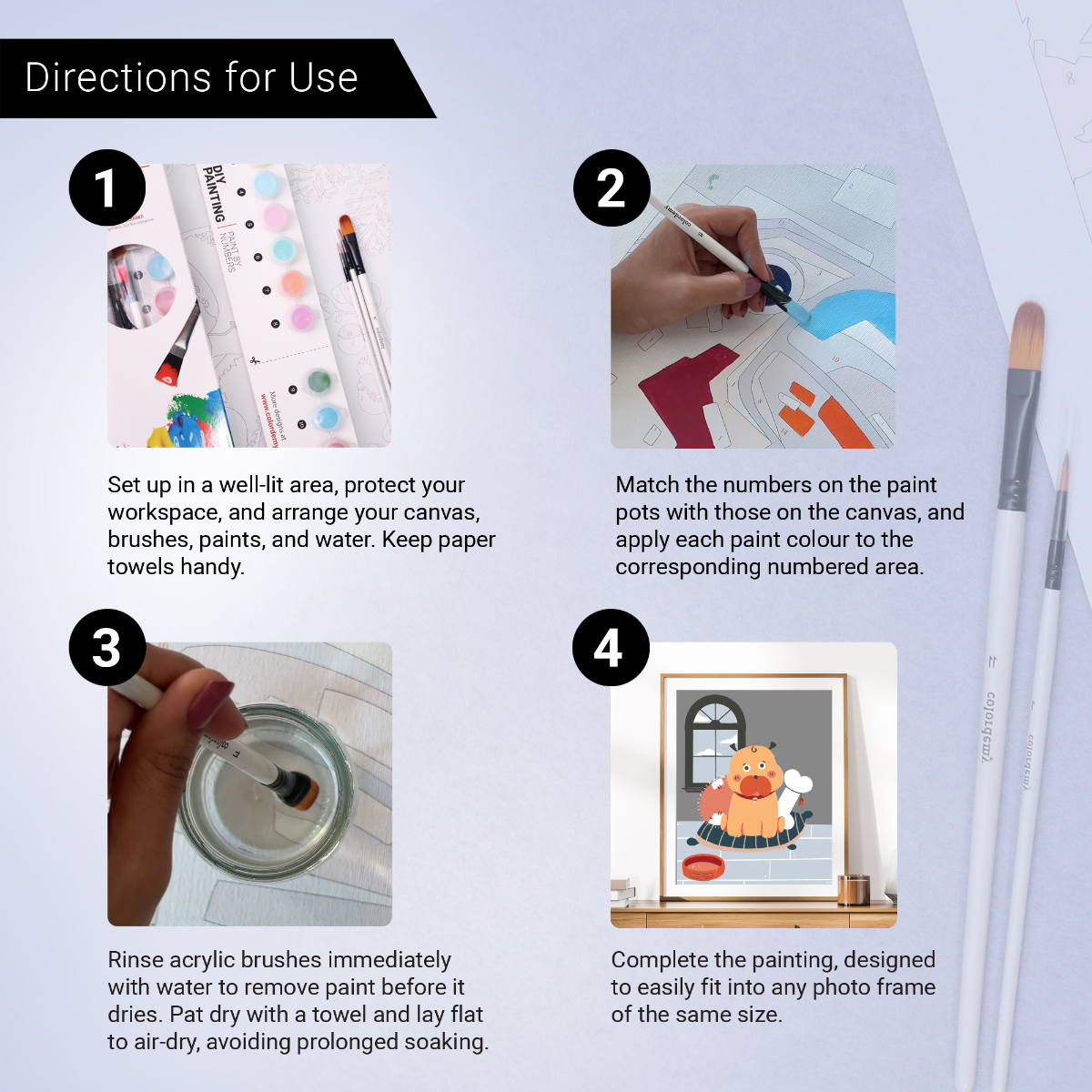 Organise your paints: Arrange the paints according to their labeled numbers, matching them with the numbers on the canvas.