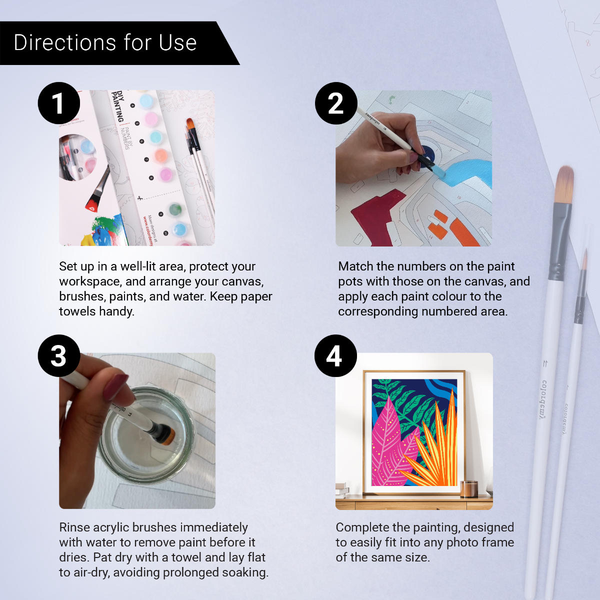 Organise your paints: Arrange the paints according to their labeled numbers, matching them with the numbers on the canvas.