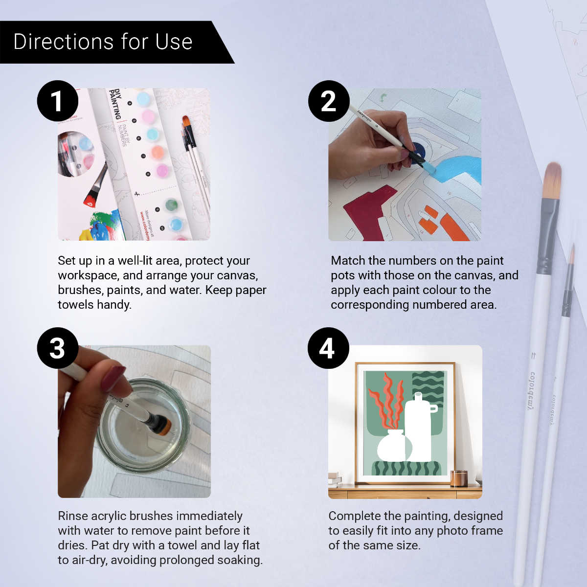 Organise your paints: Arrange the paints according to their labeled numbers, matching them with the numbers on the canvas.