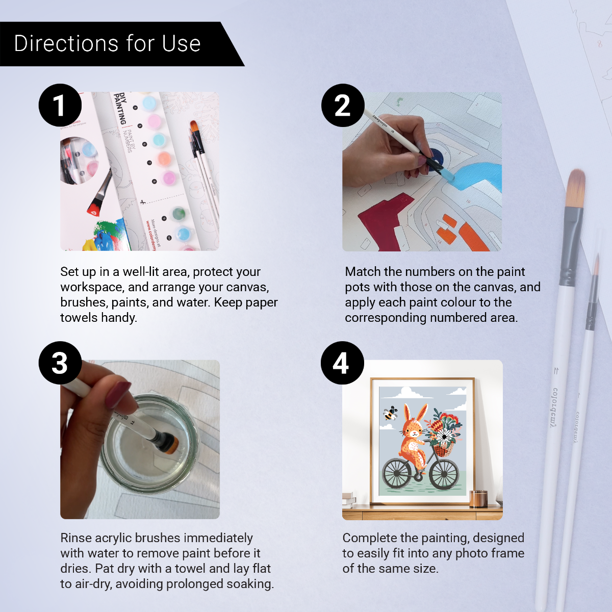 Organise your paints: Arrange the paints according to their labeled numbers, matching them with the numbers on the canvas.