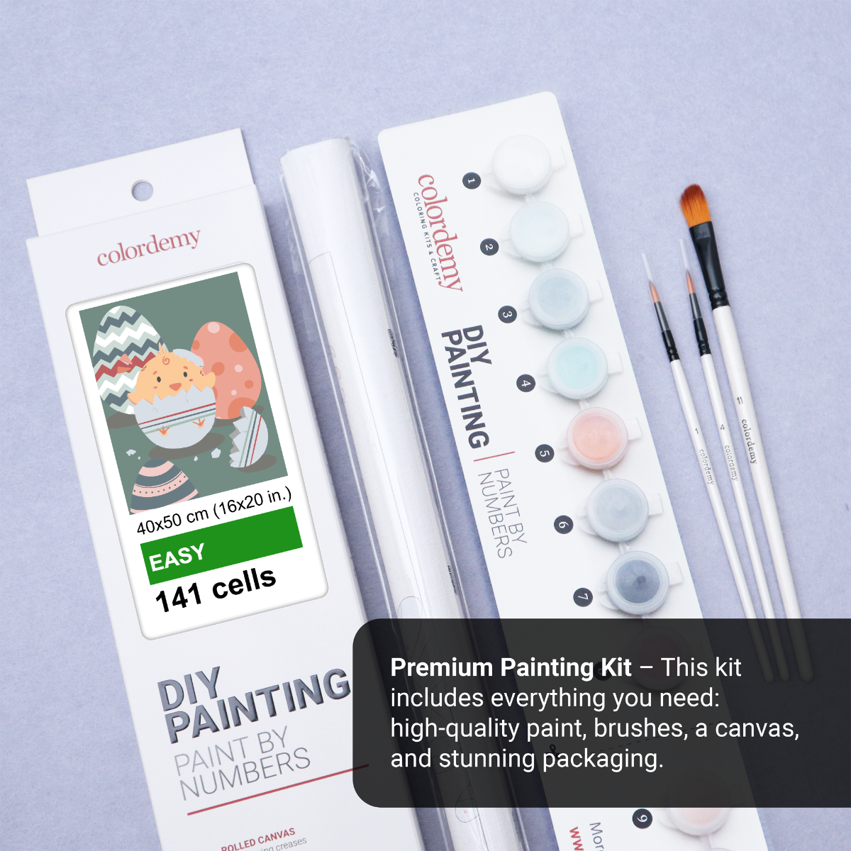 Prepare your materials: Gather your paint by numbers kit, including the canvas, paints, and brushes.