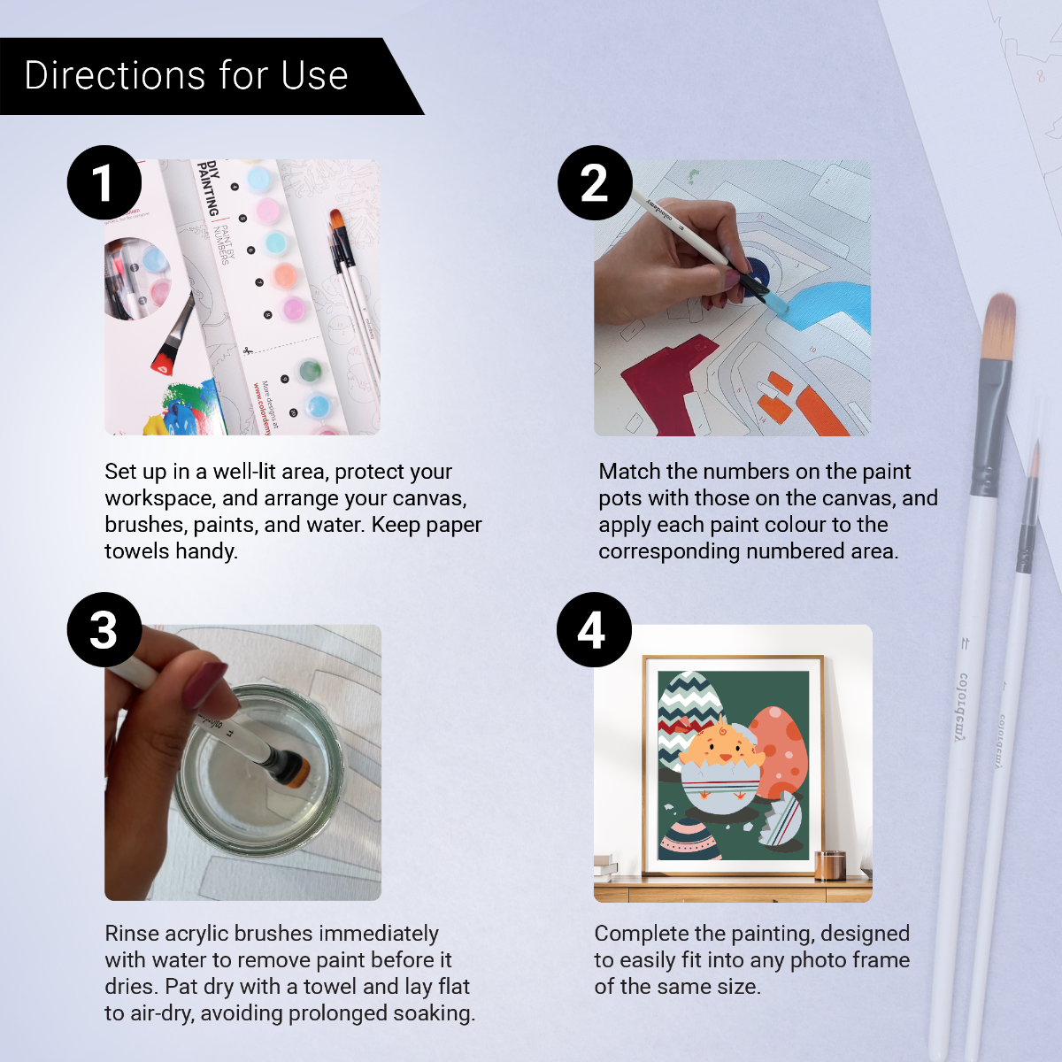 Organise your paints: Arrange the paints according to their labeled numbers, matching them with the numbers on the canvas.