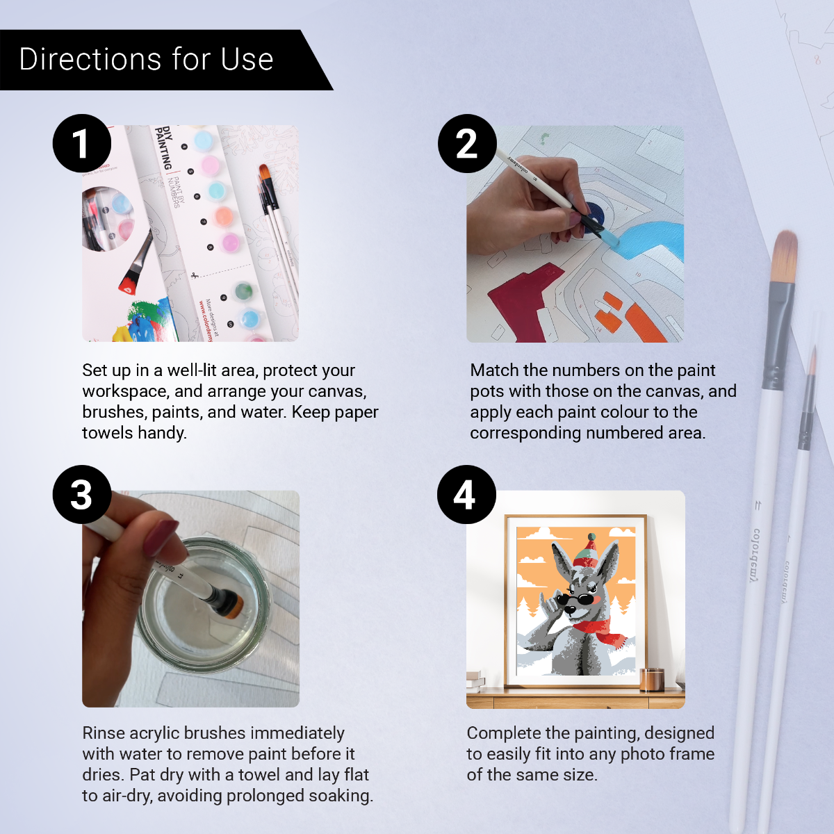 Organise your paints: Arrange the paints according to their labeled numbers, matching them with the numbers on the canvas.